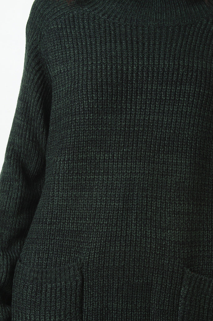 Description This marled knit dress features a mock neckline, long sleeves, square front pockets, vent slits, and high low hemline. Accessory sold separately. 80% Acrylic, 20% Wool.
