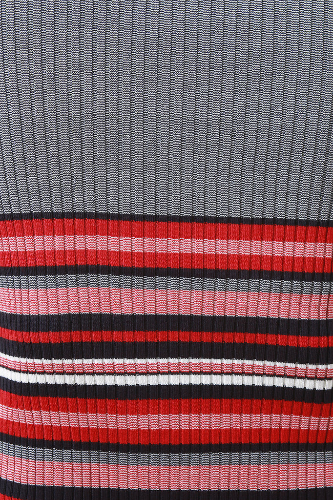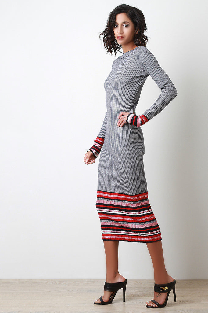 This midi dress features vertical ribbed knit construction, round neckline, long sleeves, and striped hemline. Accessory sold separately.