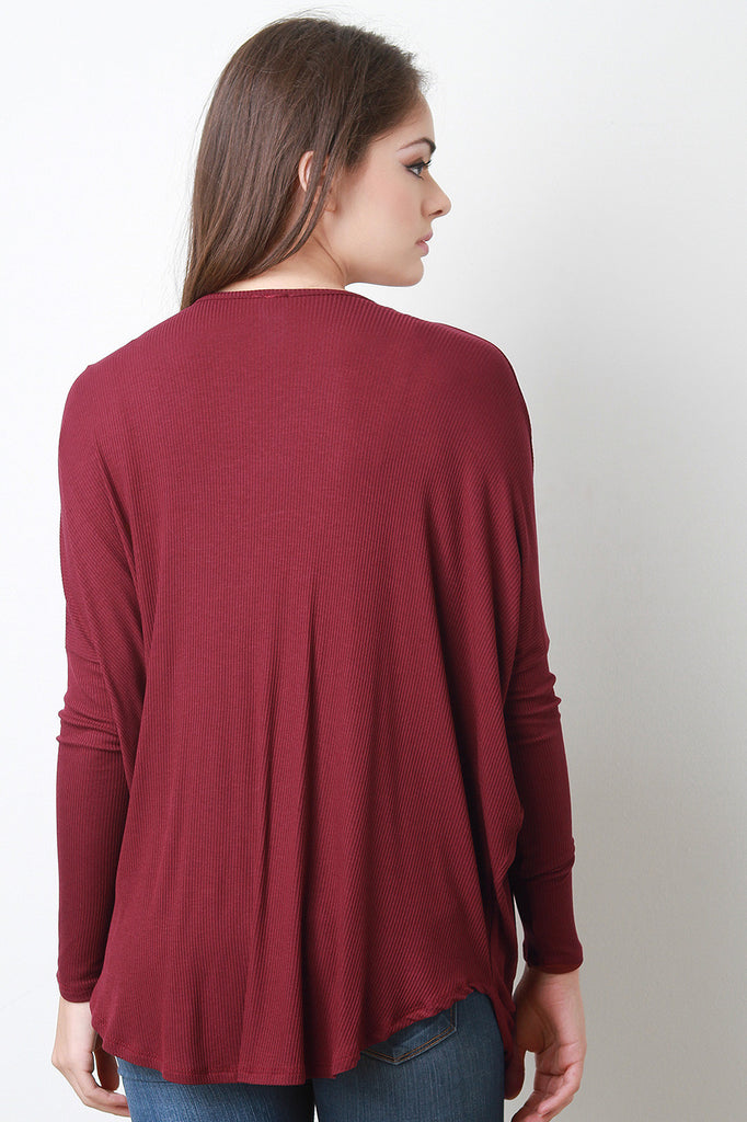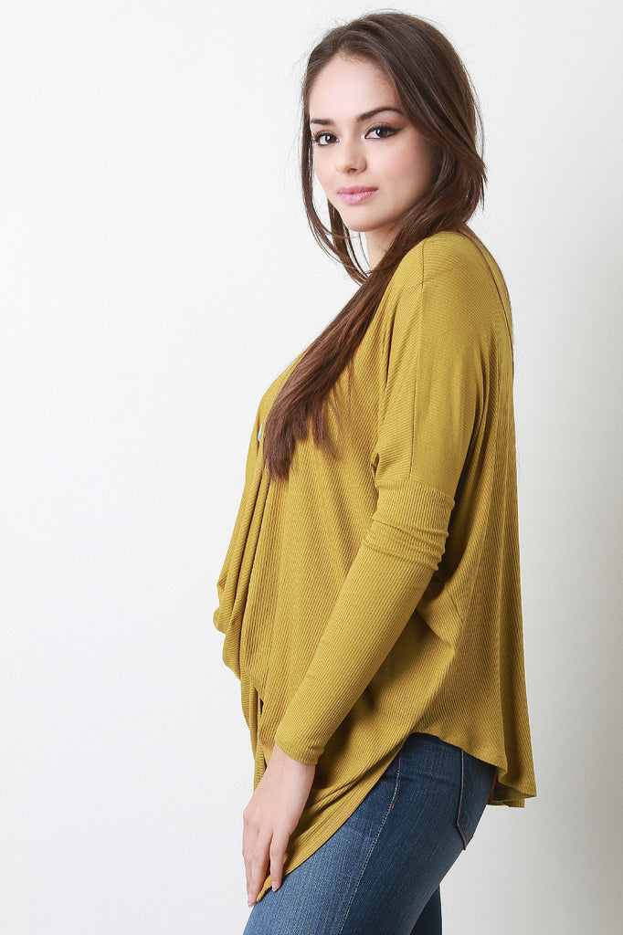 Description This ribbed knit top features a plunging twisted constructed front, long sleeves, and an asymmetrical hemline. Accessories sold separately. Made in U.S.A. 95% Rayon, 5% Spandex.
