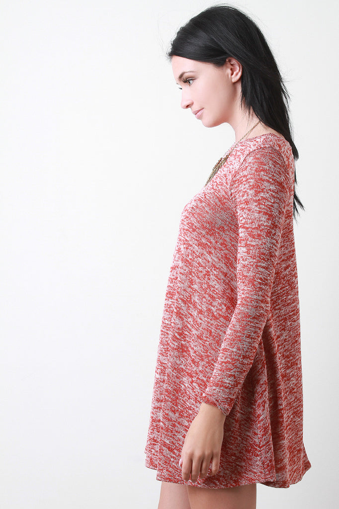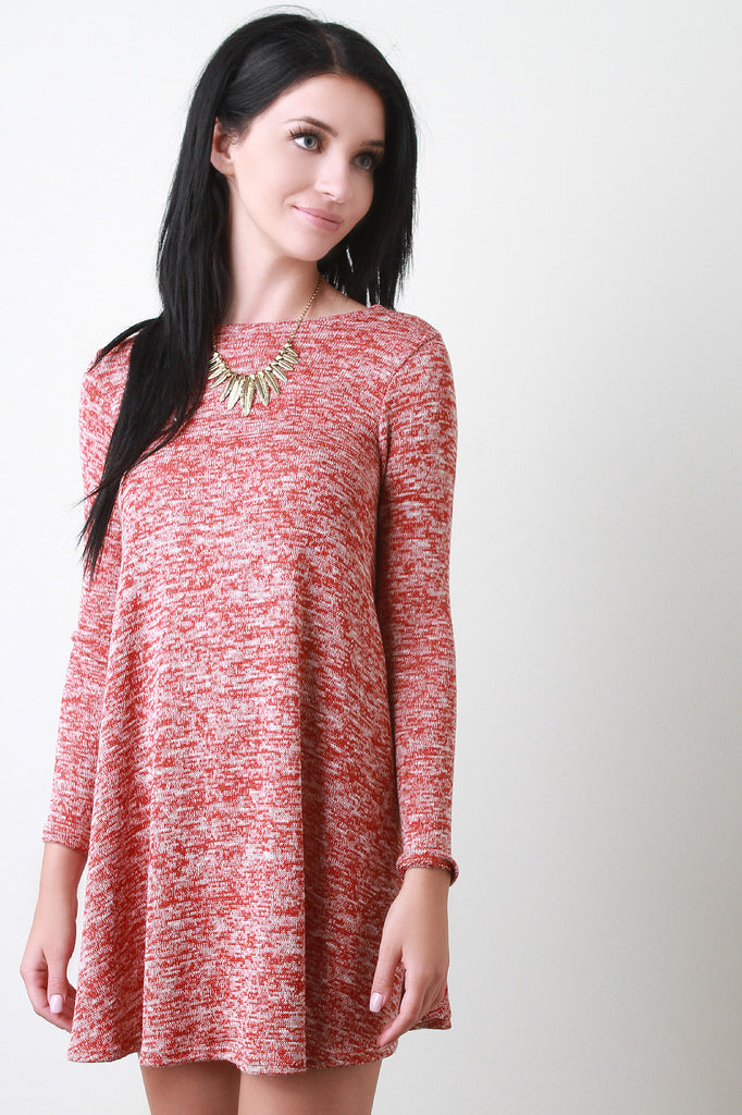 This marled knit dress features a round neckline, long sleeves, shift cut fit, and keyhole back. Accessories sold separately. Made in U.S.A. 53% Polyester, 44% Rayon, 3% Spandex.