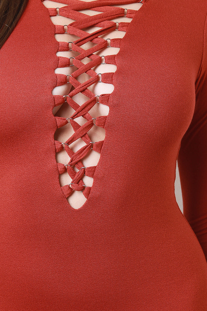 Description This trendy bodycon dress features a plunging v-neckline with corset lace-up design, long sleeves, stretchy sculpture fit, midi length hemline, and partially lined. Accessories sold separately. 95% Cotton, 5% Spandex.