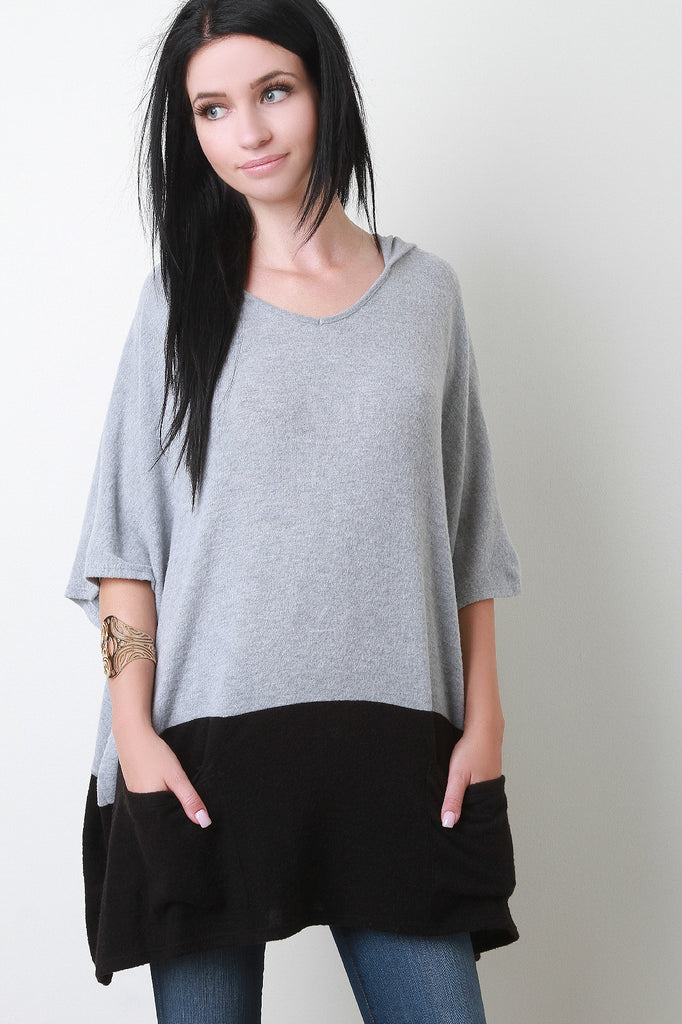 Description This two-tone hooded sweater features a soft fleecey fabric, v-neckline, and short batwing sleeves. Finished with a loose fit, two front slip pockets, and contrast color block hem. Accessory sold separately. Made in U.S.A. 67% Polyester, 29% Rayon, 4% Spandex.