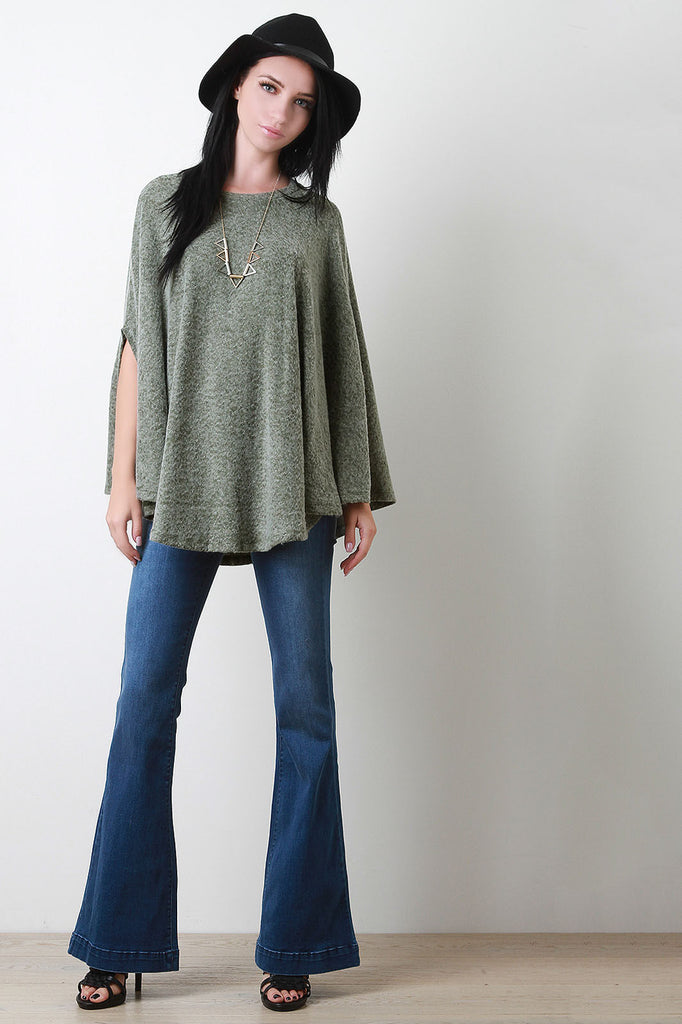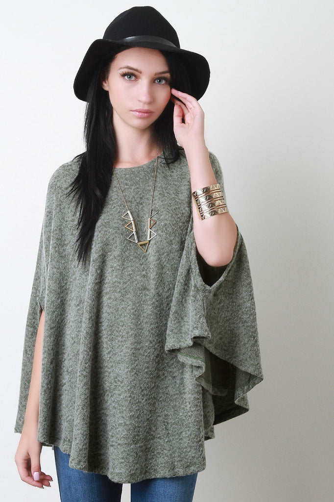 A cozy poncho cape featuring soft marl fleece-like fabric, round neckline, and arm hole slits. Accessory sold separately. Made in U.S.A. 28% Polyester, 69% Rayon, 3% Spandex.