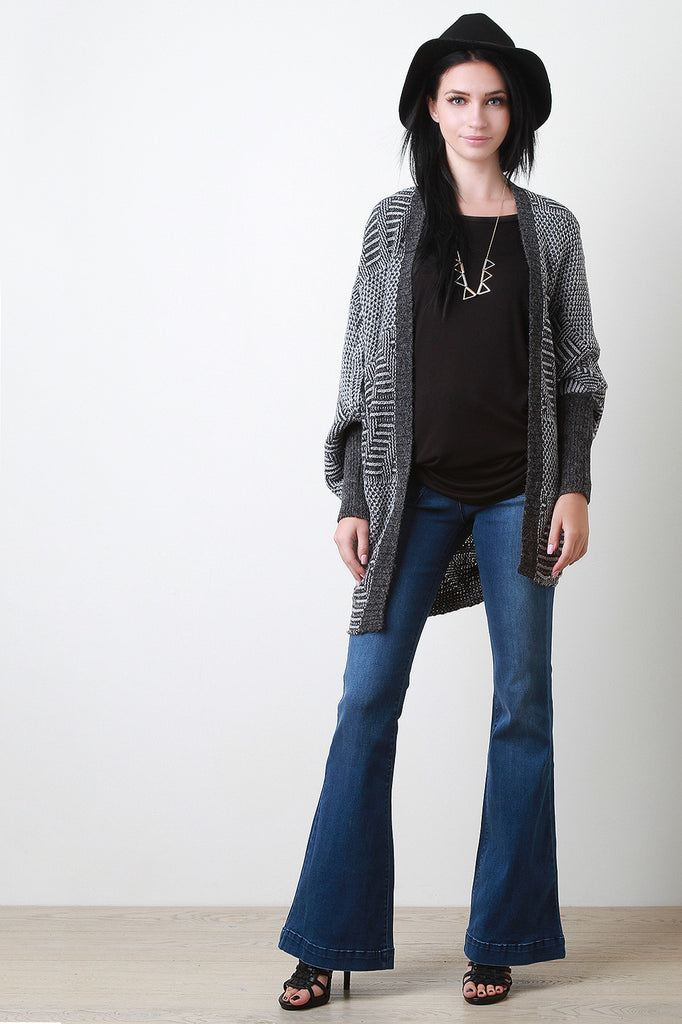 This cardigan features thick knit, mixed patterns, open front, and dolman long sleeves. Accessories sold separately. 55% Cotton, 45% Acrylic.