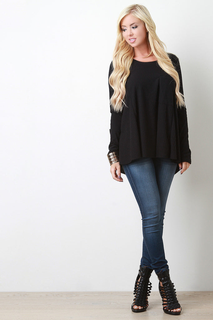 Ribbed Knit Pocket Long Sleeves High Low Babydoll Top