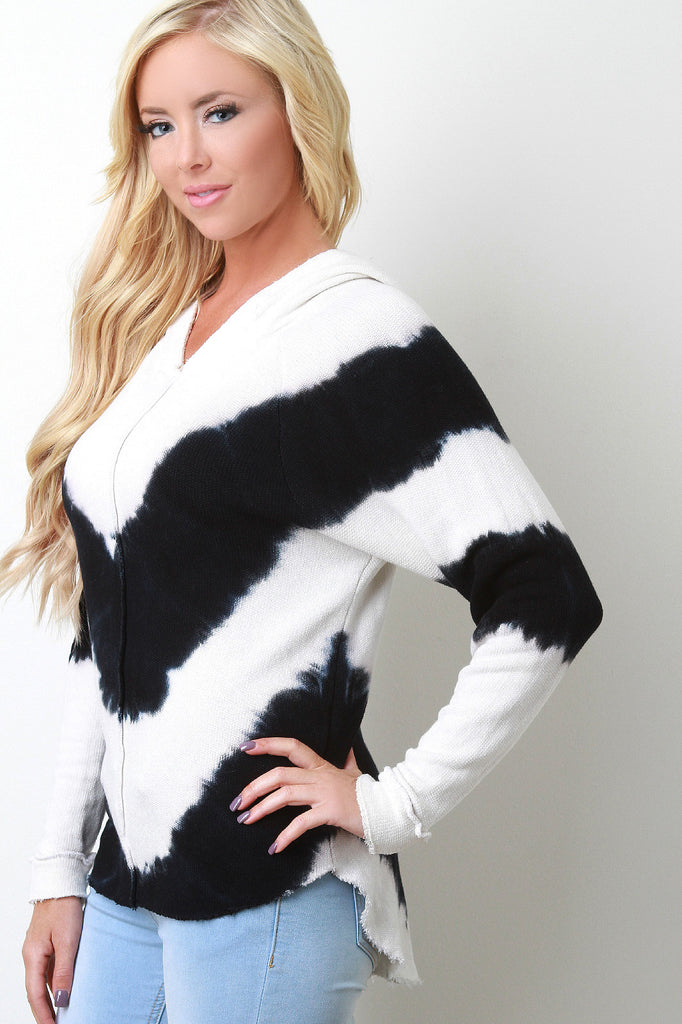 Tie Dye Chevron Long Sleeves Raw Hem Hooded High Low Top
