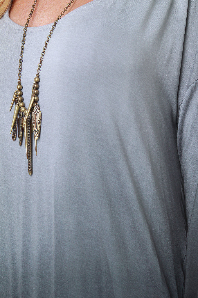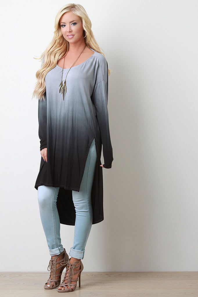 Description This loose fit midi top features an ombre knit fabrication, scooped neckline, drapery design at the back, double side slits, and finished with high low hemline. Accessories sold separately. Made in U.S.A. 95% Rayon, 5% Spandex.