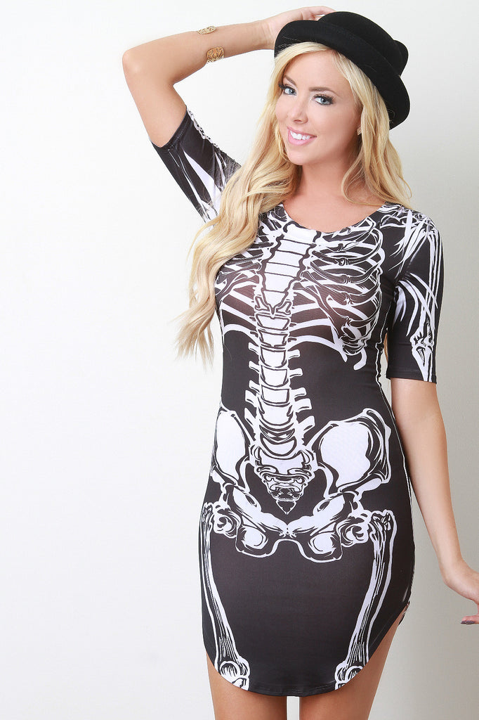 This bodycon dress features a round neckline, short sleeves, rounded hemline, and skeleton print design. Accessories sold separately. Made in U.S.A. 92% Polyester, 8% Spandex.