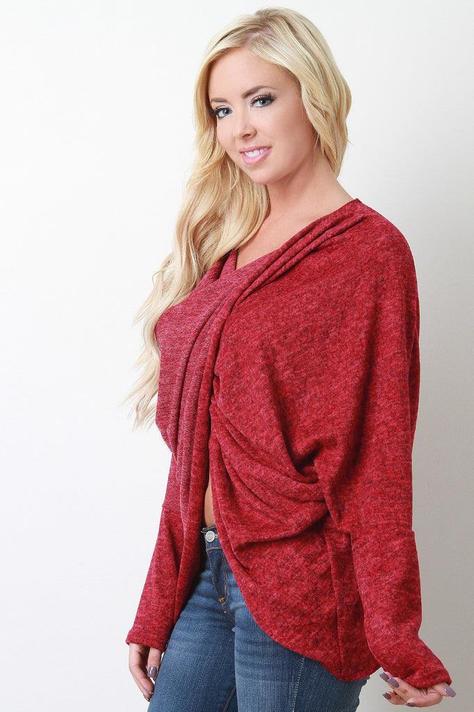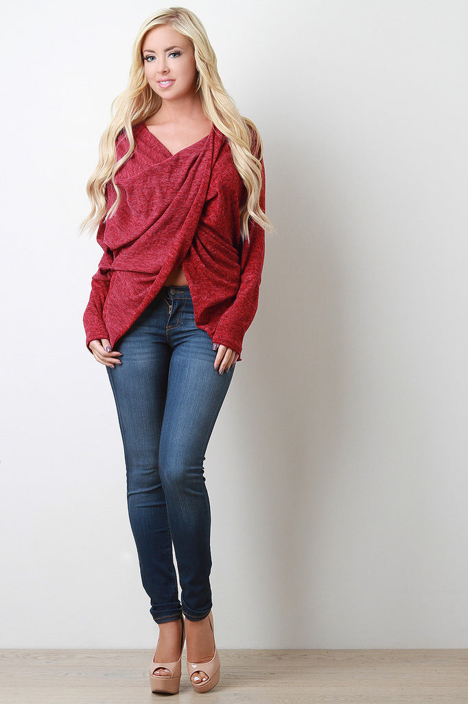 Description This lightweight sweater top features a twisted constructed front, long dolman sleeves, and arched crop midsection. Accessories sold separately. Made in U.S.A. 65% Polyester, 35% Rayon.