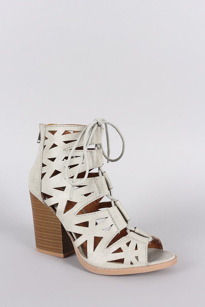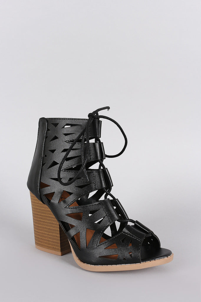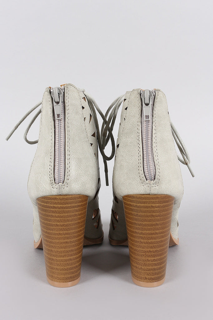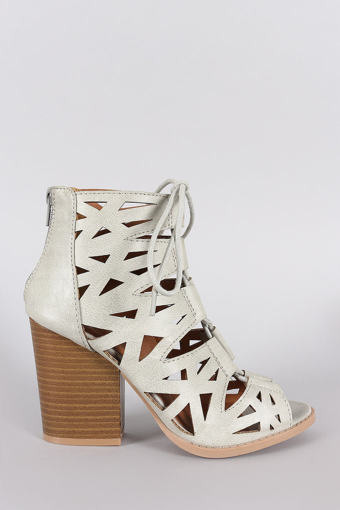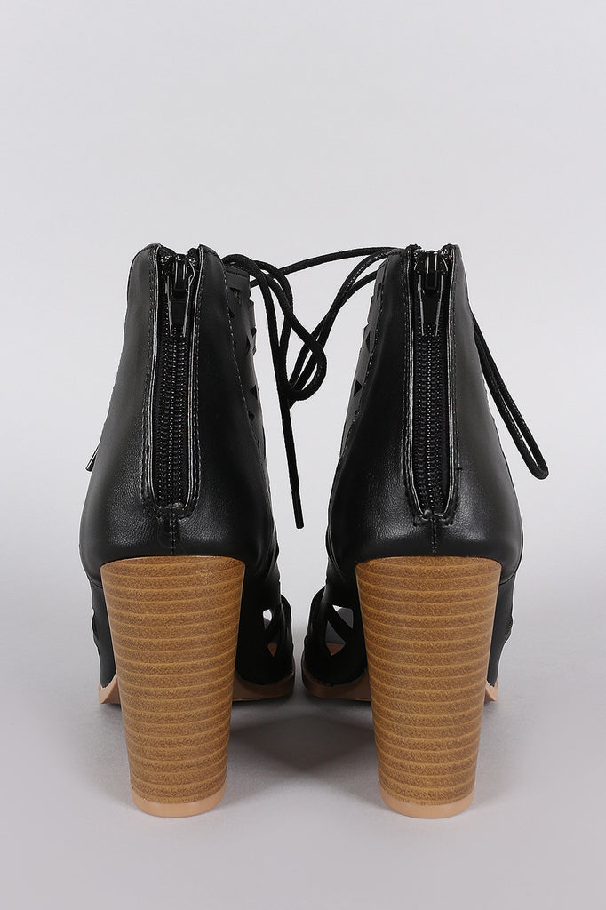 Description This striking peep toe heel features a cutouts design vamp with corset style lace up front, stitching accents, and chunky stacked heel. Finished with lightly padded insole and rear zipper closure for easy on/off.