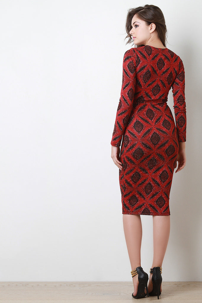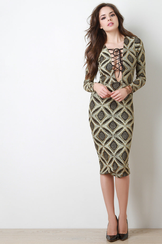 Description This midi dress features glitter stretch knit, geo pattern, plunge neckline with corset lace design, and long sleeves. Accessories sold separately. Made in U.S.A. 86% Nylon, 9% Metallic, 5% Spandex.