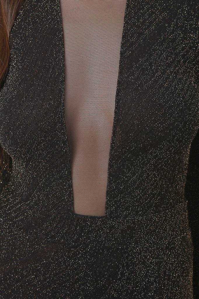 Description This dressy maxi dress features a gold-tone metallic knit fabrication, high round neckline, long sleeves, left vent slit, semi-sheer mesh center panel, backless cutout design, and double button closure at nape. Accessories sold separately. Made in U.S.A. 45% Polyester, 34% Nylon, 15% Metallic, 8% Spandex.