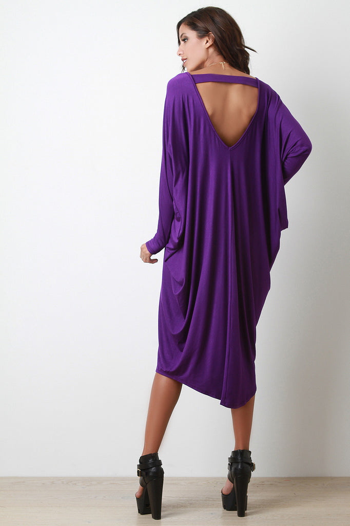 This loose-fit midi dress features solid color jersey knit, a plunging  v-neckline, and long dolman sleeves. Finished with a large keyhole back. Accessories sold separately. Made in U.S.A. 96% Rayon, 4% Spandex.