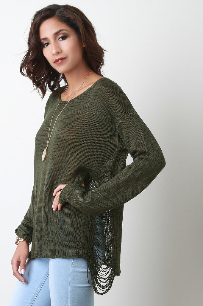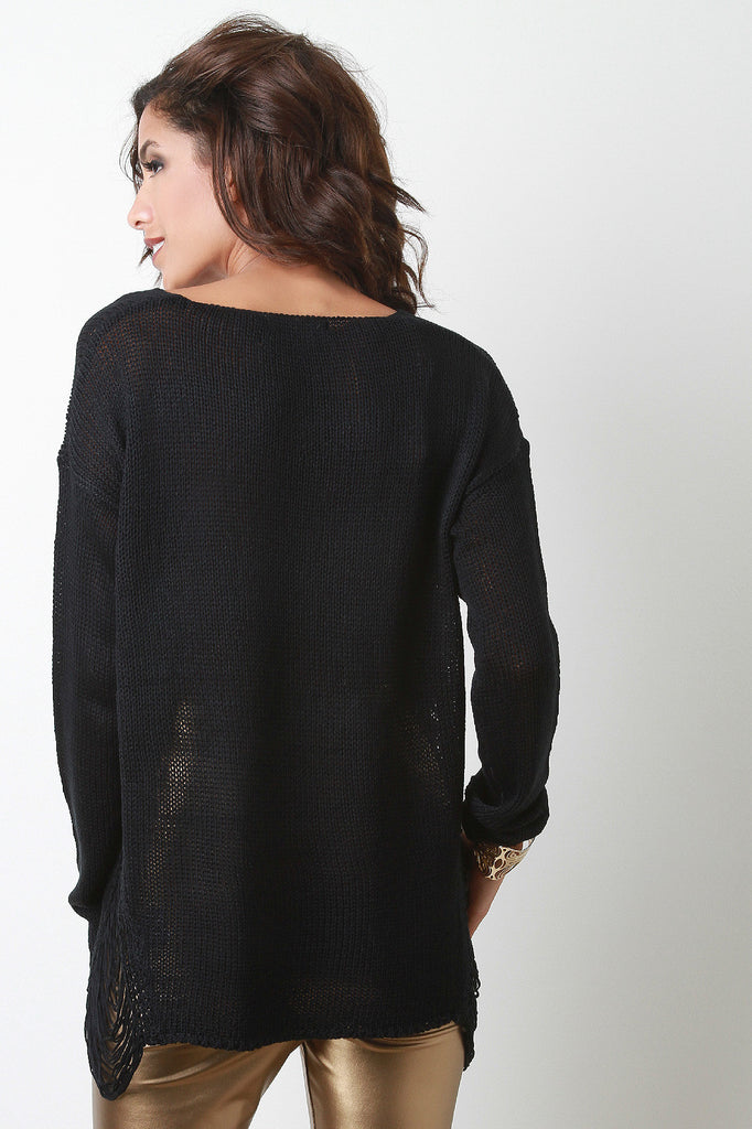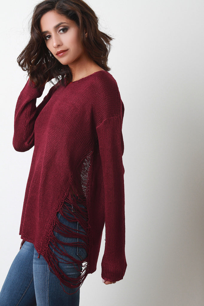 Description This knitted sweater top features a round neckline, long sleeves, relax fit, and triangle frayed design at sides. Accessories sold separately. Made in U.S.A. 100% Acrylic.