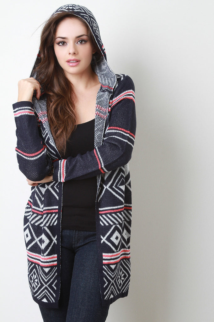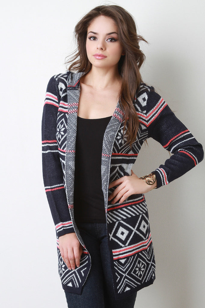 Description A hooded knit cardigan featuring a fair isle pattern throughout, an open front, and full sleeves. Accessories sold separately. 75% Acrylic, 25% Mohair.
