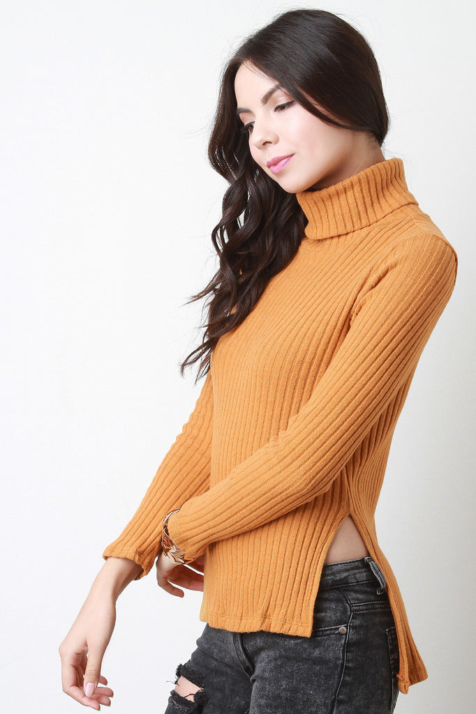 Description This ribbed knit sweater top features a turtleneck, long sleeves, side slits, and high-low hemline. Accessories sold separately. Made in U.S.A. 48% Rayon, 48% Polyester, 4% Spandex.