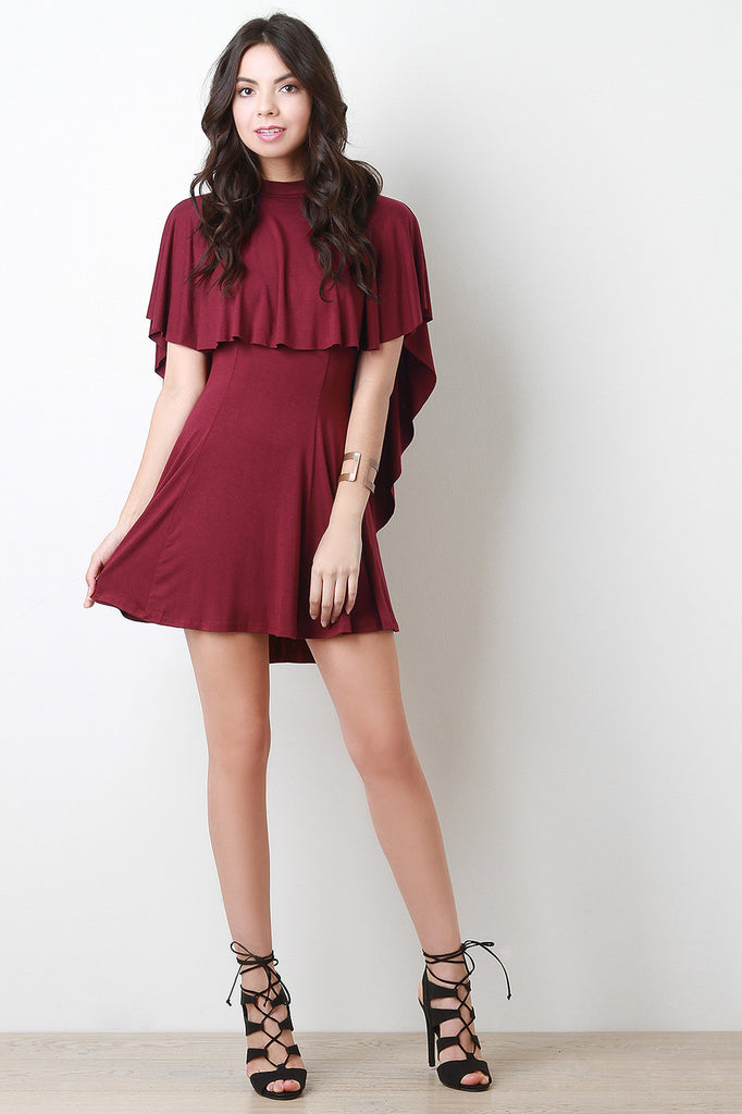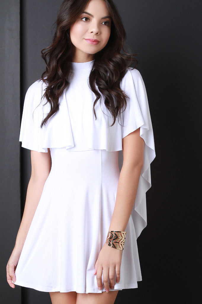 Description This jersey knit dress features a asymmetrical cape tier, mock neckline, short sleeves, and skater flare skirt. Accessories sold separately. 65% Rayon, 5% Spandex.